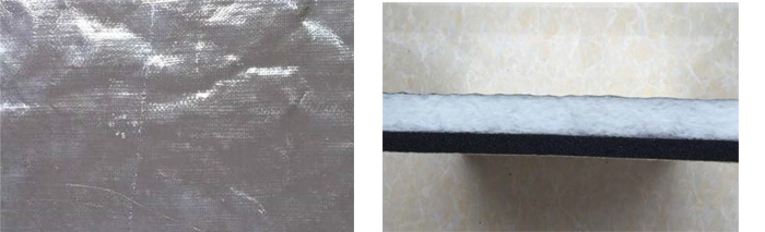 材料:表面为玻纤铝箔,中间白色为高性能玻璃纤维绵,中下层黑色为海绵,背面为自粘背胶